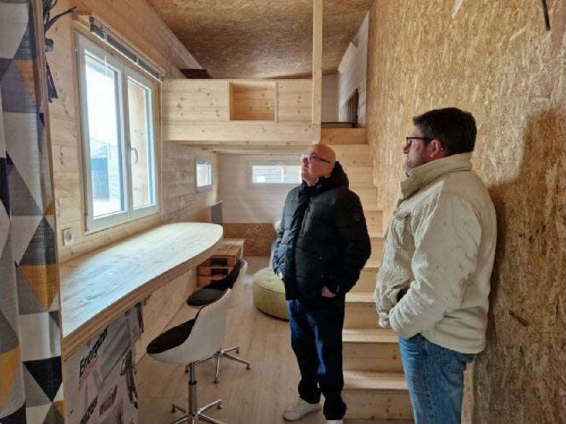 10 Février 2025 || Cette tiny-house est spacieuse. Félicien Ducrot et ses ouvriers d' Eco Bois Construction l'ont créé avec la même isolation que la norme RE 2020. Nicolas Dubois (en noir), agent immobilier, est chargé de la vendre.